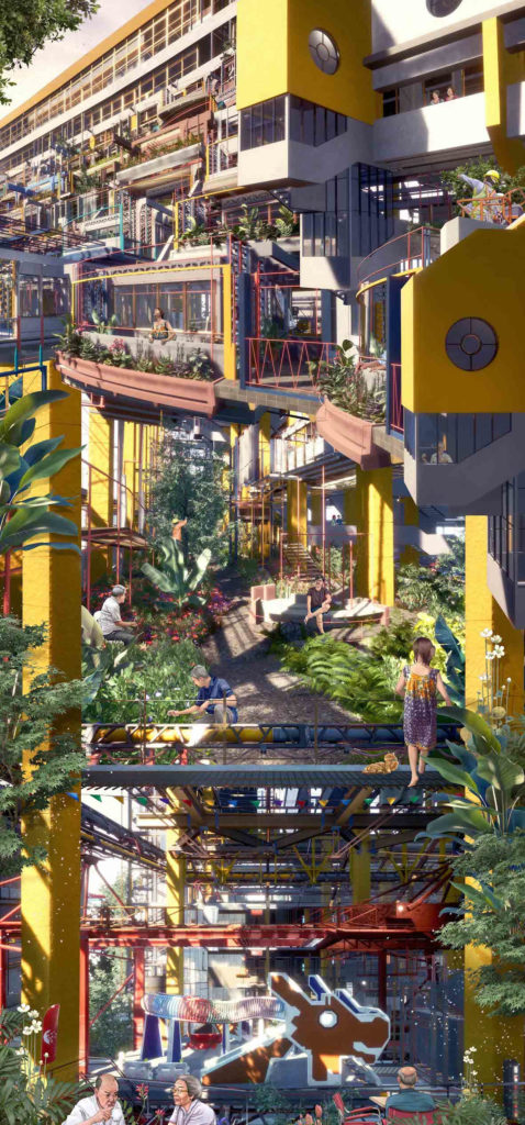 Jerome Xin Hao Ng’s drawing shows an alternative vision for Singapore’s Golden Mile Complex, a landmark residential block and important icon of 1970s Metabolism facing potential demolition. In this vision the building is saved, preserving Singapore’s threatened urban infrastructure; allowing new and existing residents to forge new memories, whilst giving space for the past to breathe.