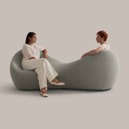 The lounge chair, ottoman and sofa work great in diverse workspaces, from quiet corners to lively collaboration zones. The tête-à-tête — an unusual but elegant nod to a classic French form that invites conversation — thrives in large, fluid settings where people gather informally.