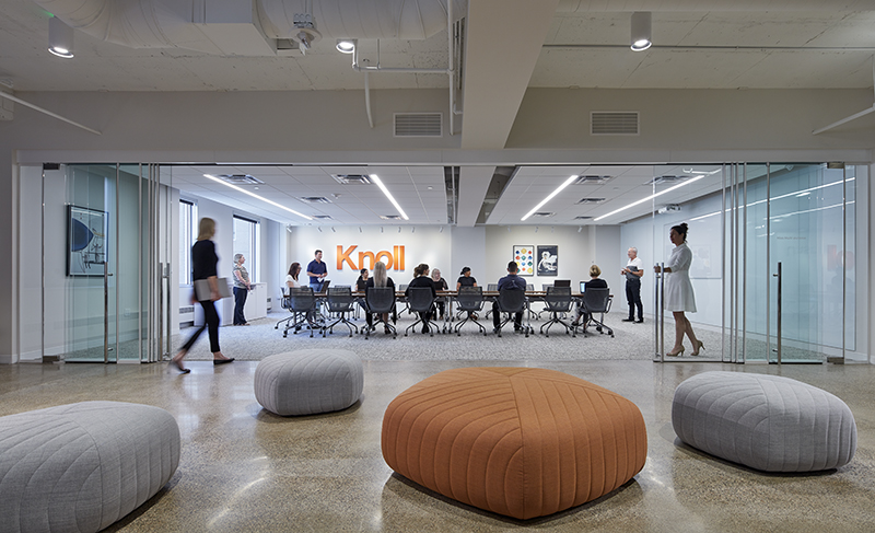 “The responses we got were interesting, but pretty much all over the place. For example, some said, ‘We only want to see 6×6 offices because that’s all our clients are buying these days.’ Or ‘We only want to see small offices, because nobody’s putting in big private offices.’ So we took some of that into account, but one of the driving factors for us was that we wanted this to look like an office. For one thing, this is where we work, and for another, this is where a design firm or architect is bringing their client in for a tour to see what Knoll has to offer. Instead of having a showroom with a bunch of little vignettes, we wanted this to look like a cohesive office so the client could imagine themselves just picking up and moving into this space.”