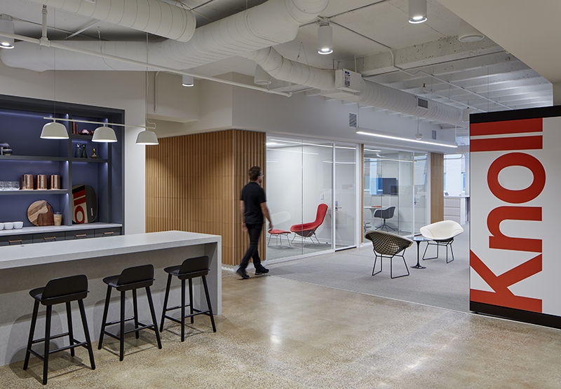 “But as I said, we work here. In fact, about half of the 16,000 square feet is for us, and the other half is public space. When it came to designing the workstations, we carefully selected finishes so that even though we show all the different laminates that Knoll has and all the different configurations of furniture, when you look at it, it all looks very similar – it all works together. To people who are coming in to tour the space, it all looks like an office where they could work. But we are aware of the variety of products shown and can demonstrate Knoll’s various product lines when that’s the level of detail the client wants to see.”