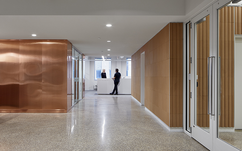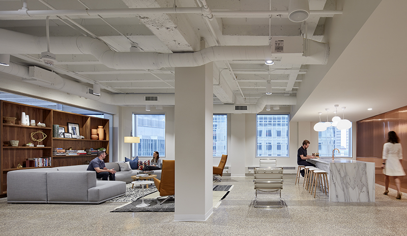 In an officeinsight interview, Ms. Vohs said, “I know the two owners, and I knew they were designers at heart. And they have deep relationships in the local design community. So while preparing my response to the RFP, I had the idea of changing the whole notion of a dealer showroom. I envisioned a refined space that could tell a clear brand story. One that could showcase the products Parameters sells, but in an environment that could speak to prospective clients and show them what their spaces could be like. A showroom that demonstrated the use of tech and how lounge and amenities and flexible meeting rooms could work with 6×6 workspaces.”
